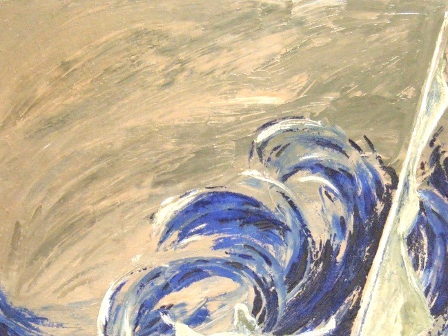 Maintenant je suis des yeux la pointe fine de la barque, je lève un peu le regard et je suis attiré par l’étendue claire qui occupe le grand tiers gauche du tableau. Je contemple et arrive à discerner dans le creux d’une vague comme un morceau de la ligne d’horizon. Je ne suis donc pas totalement enfermé dans l’obscurité et l’angoisse. Je peux laisser mon esprit s’envoler vers cet horizon de lumière…