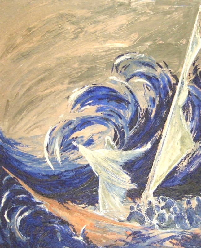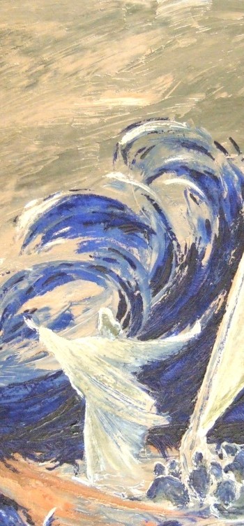 Et puis, je déplace mon regard vers le centre du tableau, attiré par une grande silhouette revêtue d’un vêtement blanc-beige, des couleurs douces et chaudes. Je sais que c’est Jésus qui dormait à l’arrière de la barque.
