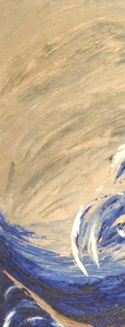 Mon regard est attiré, impressionné par les masses sombres; je distingue plusieurs nuances de bleu foncé allant jusqu’au noir. Je reconnais des vagues représentées par de grandes lignes courbes très accentuées, dessinant presque des cercles qui soulignent l’atmosphère enfermante et angoissante. Ces vagues rivalisent en hauteur et occupent pratiquement les 2/3 de la hauteur du tableau. Je suis impressionné par leur force, leur puissance et leur démesure.