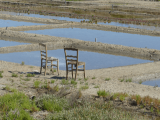 Je me dispose à la prière en contemplant cette photo. Je m’arrête sur ce cadre paisible : les rectangles de boue, patiemment travaillés par l’homme ; l’eau calme, qu’aucune brise ne vient troubler ; quelques dépôts blanchâtres, prometteurs de la fleur de sel…Mon attention se fixe sur ces deux chaises paillées, insolites…sont-elles en attente d’une visite ? Verront-elles sans tarder des promeneurs y faire halte, le temps d’un échange ? Sont-elles définitivement abandonnées, comme si toute perspective de conversation était perdue…Elles sont disposées côte-à-côte, et non vis-à-vis…