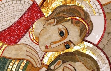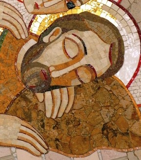 Je contemple la mosaïque du songe de Joseph. La main de l’ange tendrement posée sur l’épaule de Joseph. J’imagine la délicatesse de la voix, qui murmure à l’oreille de Joseph.