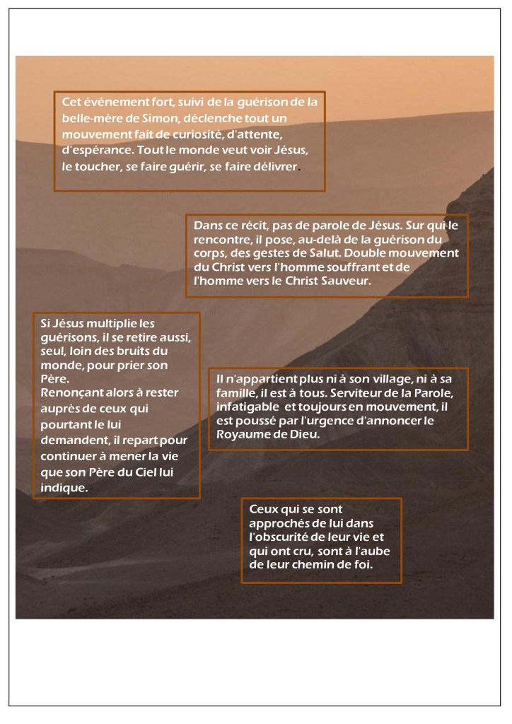 Le lendemain, Jésus se leva, bien avant l’aube. Il sortit et se rendit dans un endroit désert,et là il priait. Simon et ceux qui étaient avec lui partirent à sa recherche. Ils le trouvent et lui disent :« Tout le monde te cherche. »Jésus leur dit :« Allons ailleurs, dans les villages voisins, afin que là aussi je proclame l’Évangile ;car c’est pour cela que je suis sorti. »