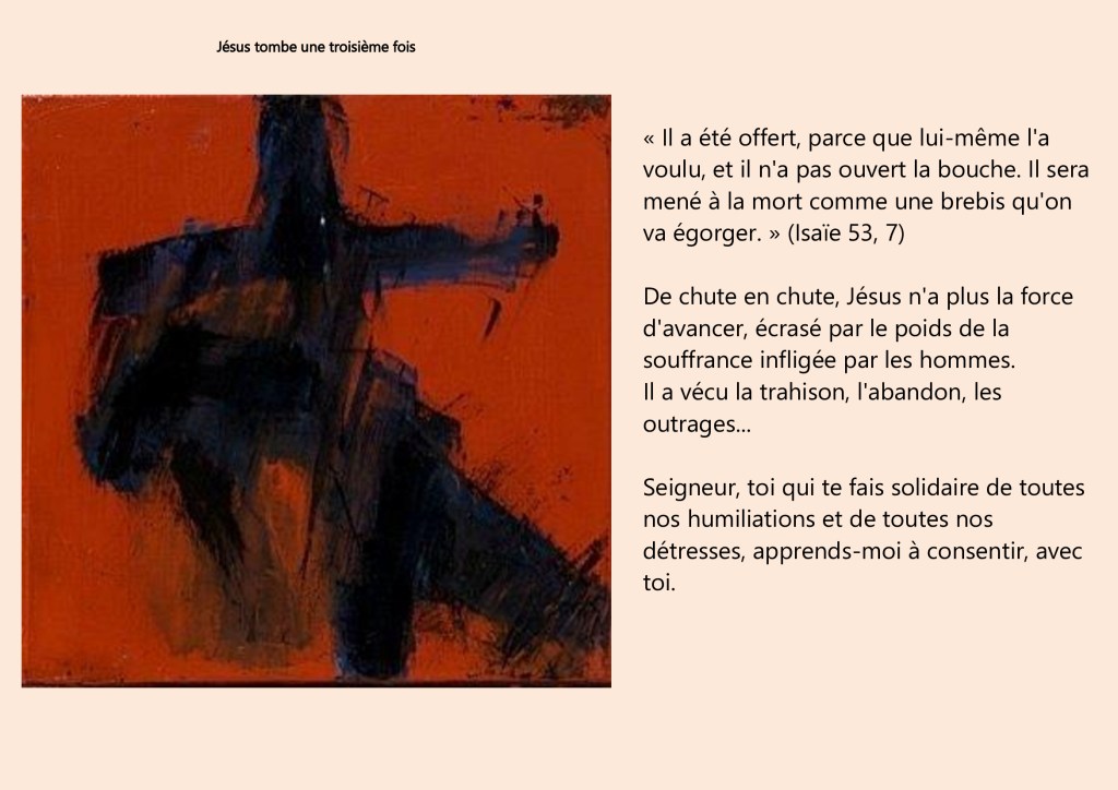 Jésus tombe une 3e fois- Jésus est dépouillé de ses vêtements Publié le 31 mars 2021 par edvsmp Partager : Cliquer pour partager sur X(ouvre dans une nouvelle fenêtre) X Cliquez pour partager sur Facebook(ouvre dans une nouvelle fenêtre) Facebook J’aime chargement… Similaire