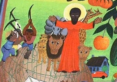 A sa gauche, Jésus porte un auréole et est entouré de bêtes sauvages ; c’est le Christ ressuscité, vainqueur du mal ; il apporte la paix pour tous les êtres vivants.