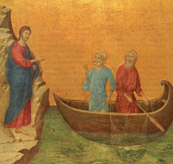 Passant le long de la mer de Galilée, Jésus vit Simon et André, le frère de Simon, en train de jeter les filets dans la mer, car c’étaient des pêcheurs. Il leur dit : « Venez à ma suite.