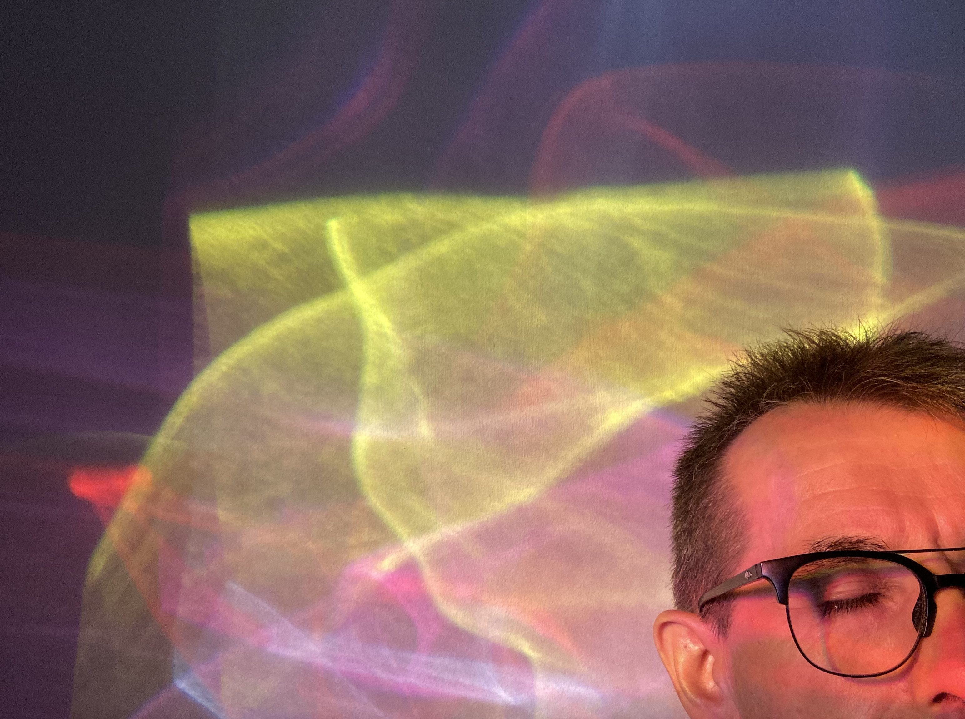 Je devine des densités différentes, des rouges et des jaunes, des vertes et des violets, quatre couleurs mêlées. Quatre, les points cardinaux, la Trinité d'amour et moi. Oui c'est bien cette réalité que je vis à cette seconde... Et la danse des couleurs qui sautillent comme des rockeurs et qui prend la volupté de la valse lente le tempo est grâce de Dieu. Rien ne m’échappe si je me laisse conduire tout mon champ visuel loue la création. Par cette lumière, je ressens de la chaleur. Comment cela peut-il se faire ?