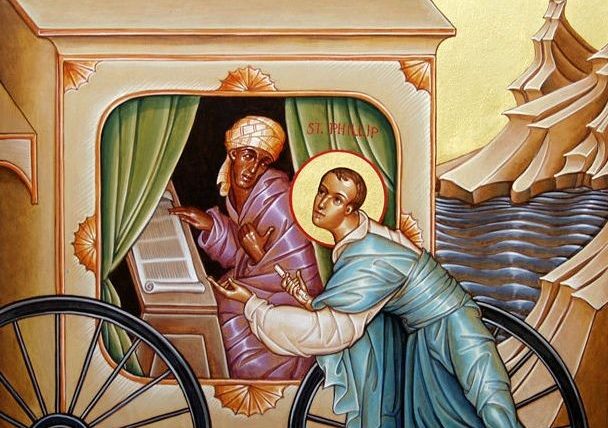 Et Philippe se mit en marche. Or, un Éthiopien, un eunuque, haut fonctionnaire de Candace, la reine d’Éthiopie, et administrateur de tous ses trésors, était venu à Jérusalem pour adorer. Il en revenait, assis sur son char, et lisait le prophète Isaïe. L’Esprit dit à Philippe : « Approche, et rejoins ce char. » Philippe se mit à courir, et il entendit l’homme qui lisait le prophète Isaïe ; alors il lui demanda : « Comprends-tu ce que tu lis ? » L’autre lui répondit : « Et comment le pourrais-je s’il n’y a personne pour me guider ? » Il invita donc Philippe à monter et à s’asseoir à côté de lui. Le passage de l’Écriture qu’il lisait était celui-ci : Comme une brebis, il fut conduit à l’abattoir ; comme un agneau muet devant le tondeur, il n’ouvre pas la bouche. Dans son humiliation, il n’a pas obtenu justice. Sa descendance, qui en parlera ? Car sa vie est retranchée de la terre. Prenant la parole, l’eunuque dit à Philippe : « Dis-moi, je te prie : de qui le prophète parle-t-il ? De lui-même, ou bien d’un autre ? » Alors Philippe prit la parole et, à partir de ce passage de l’Écriture, il lui annonça la Bonne Nouvelle de Jésus. (Actes, 8, 27-35)