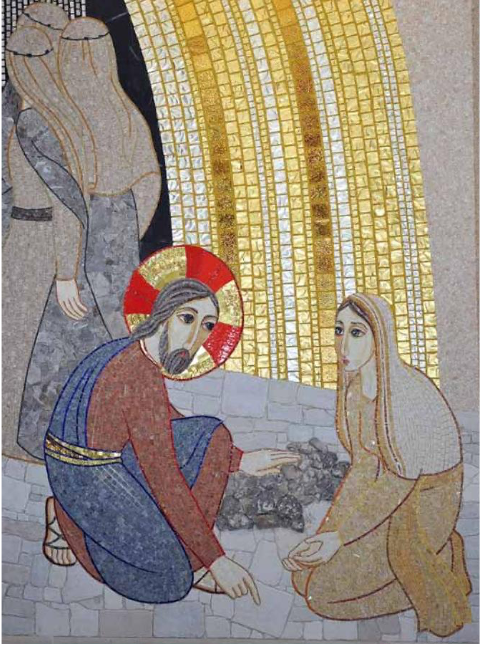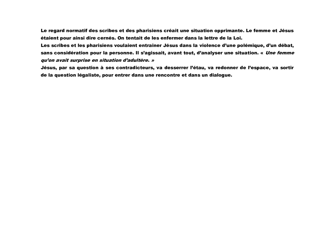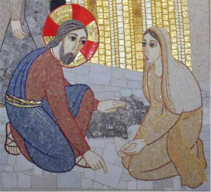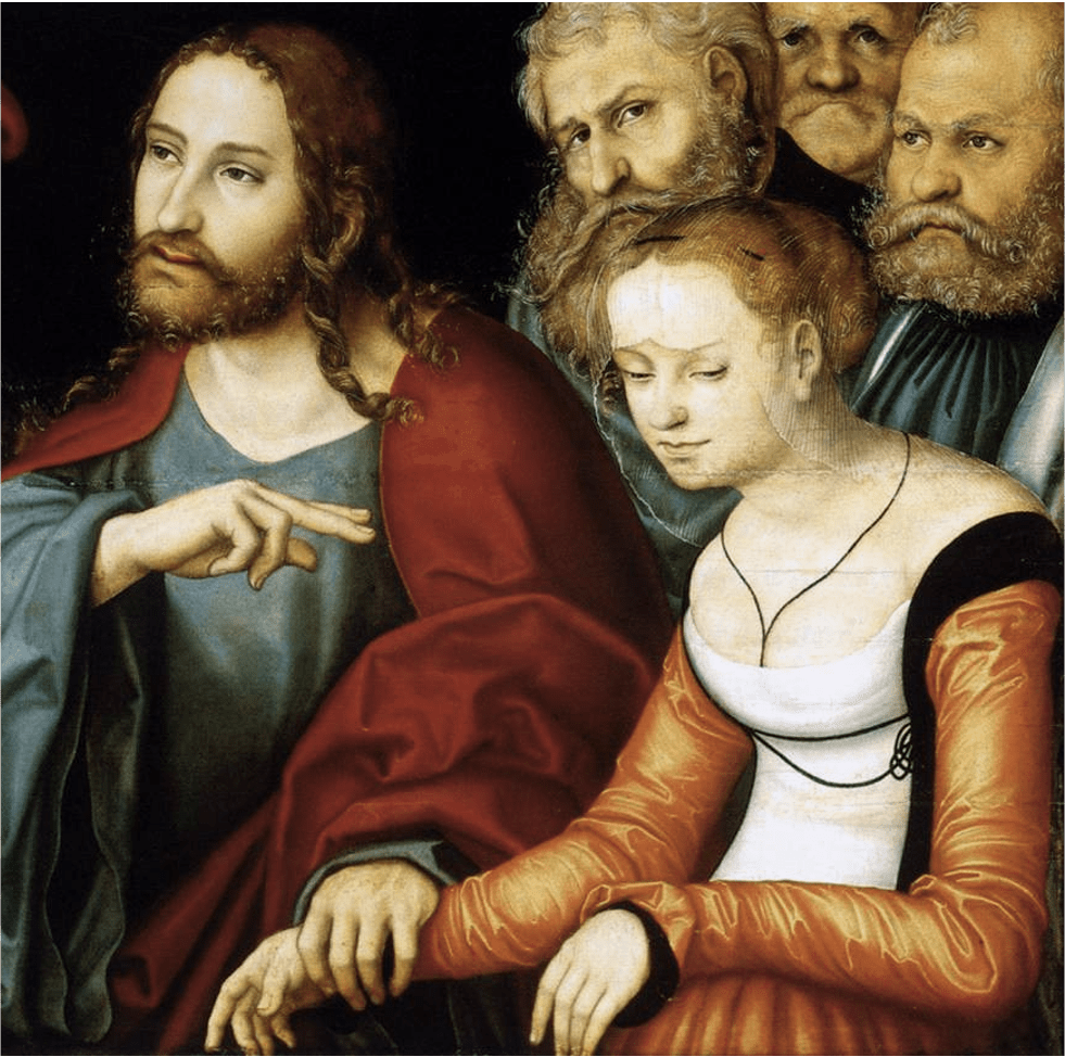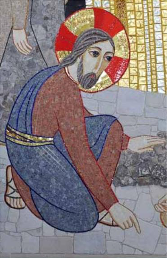 Quant à Jésus, il s’en alla au mont des Oliviers. Dès l’aurore, il retourna au Temple. Comme tout le peuple venait à lui, il s’assit et se mit à enseigner. Les scribes et les pharisiens lui amènent une femme qu’on avait surprise en situation d’adultère. Ils la mettent au milieu, et disent à Jésus : « Maître, cette femme a été surprise en flagrant délit d’adultère. Or, dans la Loi, Moïse nous a ordonné de lapider ces femmes-là. Et toi, que dis-tu ? » Ils parlaient ainsi pour le mettre à l’épreuve, afin de pouvoir l’accuser. Mais Jésus s’était baissé et, du doigt, il écrivait sur la terre.