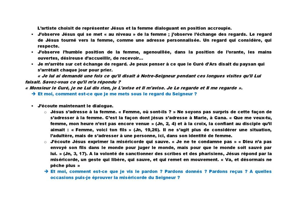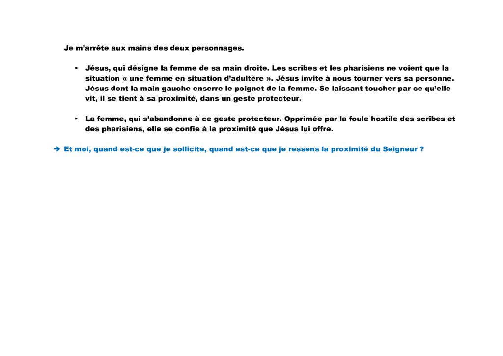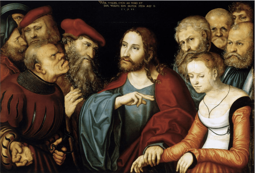 Comme on persistait à l’interroger, il se redressa et leur dit : « Celui d’entre vous qui est sans péché, qu’il soit le premier à lui jeter une pierre. » Il se baissa de nouveau et il écrivait sur la terre. Eux, après avoir entendu cela, s’en allaient un par un, en commençant par les plus âgés. Jésus resta seul avec la femme toujours là au milieu. Il se redressa et lui demanda : « Femme, où sont-ils donc ? Personne ne t’a condamnée ? » Elle répondit : « Personne, Seigneur. » Et Jésus lui dit : « Moi non plus, je ne te condamne pas. Va, et désormais ne pèche plus. »