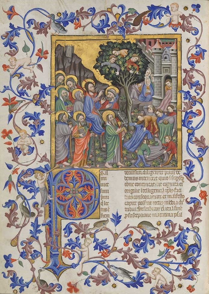 - Je regarde la partie gauche de l’enluminure : Jésus, entouré de ses disciples qui font bloc avec lui, s’avance solennellement en direction de Jérusalem. La tête avancée de l’ânon ouvre le passage.