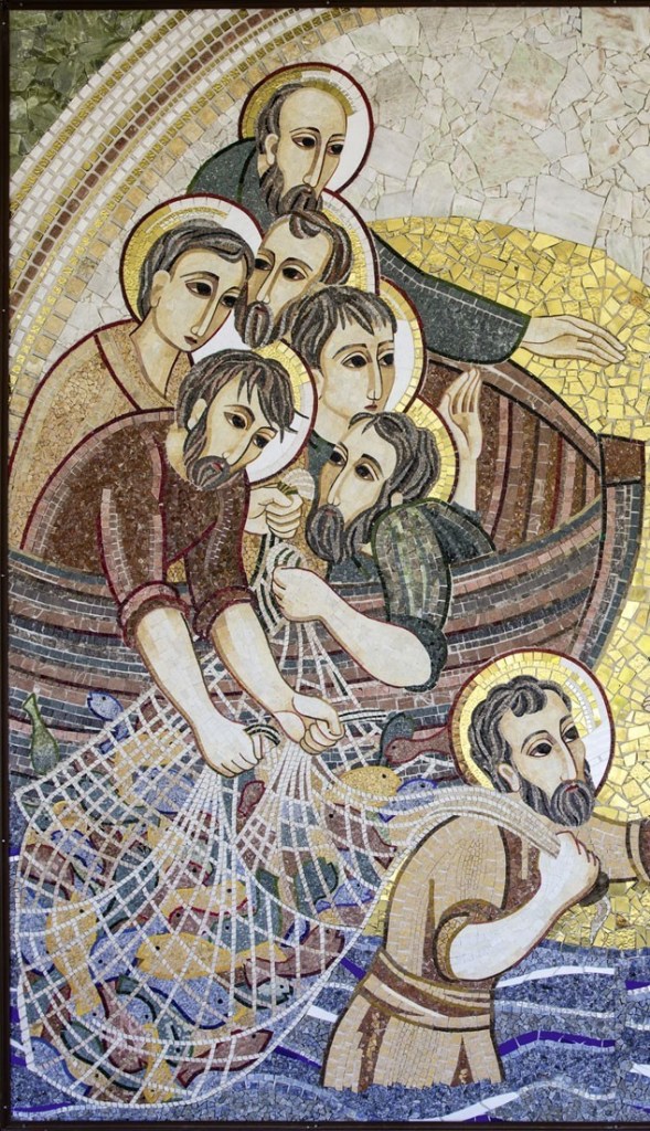 Il y a Pierre. Il tient le filet qui ne semble pas si lourd que ça. Ce sont les autres qui le tiennent fort. Il est dans une mer sombre un peu houleuse mais son regard reste fixé sur le maître. C’est sans doute ce qui allège sa tâche. Sa main est tendue dans un geste d’offrande. « Voici. » Par ce geste son poisson semble lui-même transfiguré. Pierre est en première ligne. « C’est le Seigneur ! » lui a soufflé le disciple que Jésus aimait.