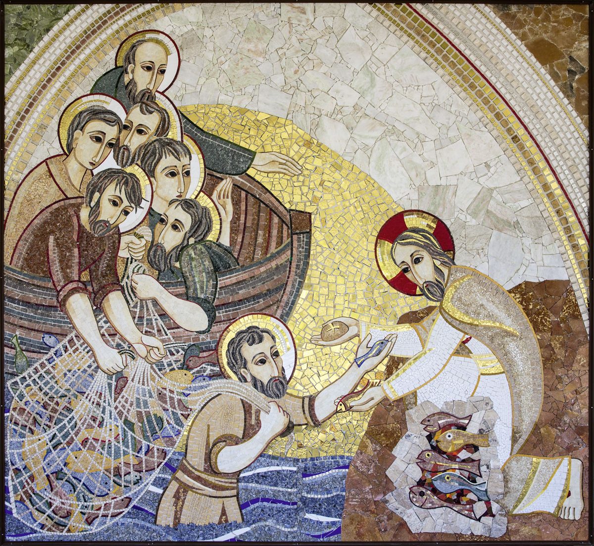 Cette mosaïque est pour nous aujourd’hui comme le sont toujours dans la bible les scènes de repas. Elle est scène eucharistique. Ici, les disciples vivent une eucharistie. Regardons Pierre il offre son poisson « fruit du travail des hommes ». Je remarque la couleur de son poisson. Fruit de ceux qui sont derrière lui. Fruit de toute l’humanité. C’est l’Eglise tout entière qui participe à cette offrande. C’est l’Eglise avec ses angoisses, ses peurs, sa confiance, son espérance, sa foi. Une Eglise en chemin de sainteté. Voyez les auréoles autant celle du Christ est bien délimitée, colorée, celles des disciples sont en devenir. Mais déjà Jésus a préparé le pain et les poissons. « Venez, prenez et mangez en tous. » Observons ces deux gestes qui se croisent. Ces bras qui s’entrecroisent mais qui sont tout autant liés aux hommes par la main droite de Pierre qui reste accrochée au filet. Ces deux gestes qui se donnent. C’est bien se qui se passe au cours de nos messes dominicales. Nous apportons le fruit du travail des hommes et déjà, Jésus ressuscité se donne tout entier à nous. C’est alors la vie de l’homme qui devient corps du Christ.