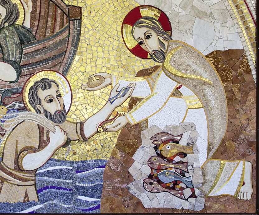 Il y a Jésus. Jésus ressuscité. Son pied porte encore la marque des clous. Son auréole en forme de croix, rouge du sang de la passion et de l’Esprit-Saint. Contemplons la ligne de son dos tout en courbe, tout en service, genou en terre, mains tendues à la fois pour recevoir, à la fois pour donner. Il a déjà préparé le pain et les poissons. Son regard est fixé sur Pierre. « M’aimes-tu lui dira-t-il quand il sera sur le rivage ?»