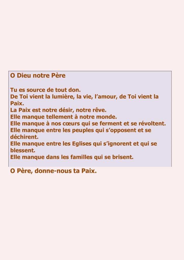 Je me tourne vers le Christ, notre espérance, Lui qui a promis la paix. Je rends grâce pour les petits gestes de fraternité que je repère dans le quotidien de ma vie ; pour les liens créés et les pardons donnés ; pour les regards bienveillants ; les paroles qui redonnent confiance…