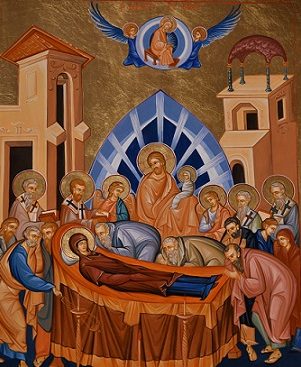 La fête de la dormition de la Vierge est instituée en Orient, dès le VIème siècle. Dans les écrits du Nouveau Testament, la vierge est mentionnée une dernière fois lors de la Pentecôte. (Actes, 1,14). Les écrits apocryphes ont rapidement évoqué la fin de la vie terrestre de Marie. On y trouve toujours les éléments suivants. Un ange annonce à Marie sa mort, paisible et sereine, tel un endormissement. De là vient le terme « Dormition ». Pour y assister, les apôtres, en mission d’évangélisation dans le monde, sont amenés miraculeusement par des anges.