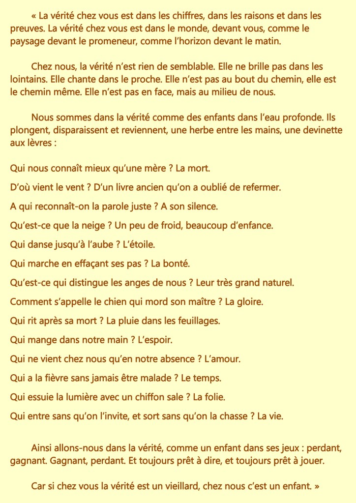 Car si chez vous la vérité est un vieillard, chez nous c’est un enfant.