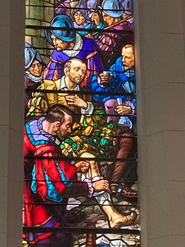Ce vitrail d’une église de Cuba relate la blessure d’Ignace de Loyola au siège de Pampelune en mai 1521. Ce gentilhomme basque rêve alors de chevalerie et de hauts faits d’arme mais le boulet qui l’atteint à la jambe met fin à sa carrière. Sa convalescence l’amène à lire des livres sur la vie des saints et sur la vie de Jésus. C’est le début de sa conversion. Décidé à suivre le Christ, il prend la route et se retire à Manrèse où il vit une expérience spirituelle. Une expérience qu’il transcrira dans les Exercices Spirituels.