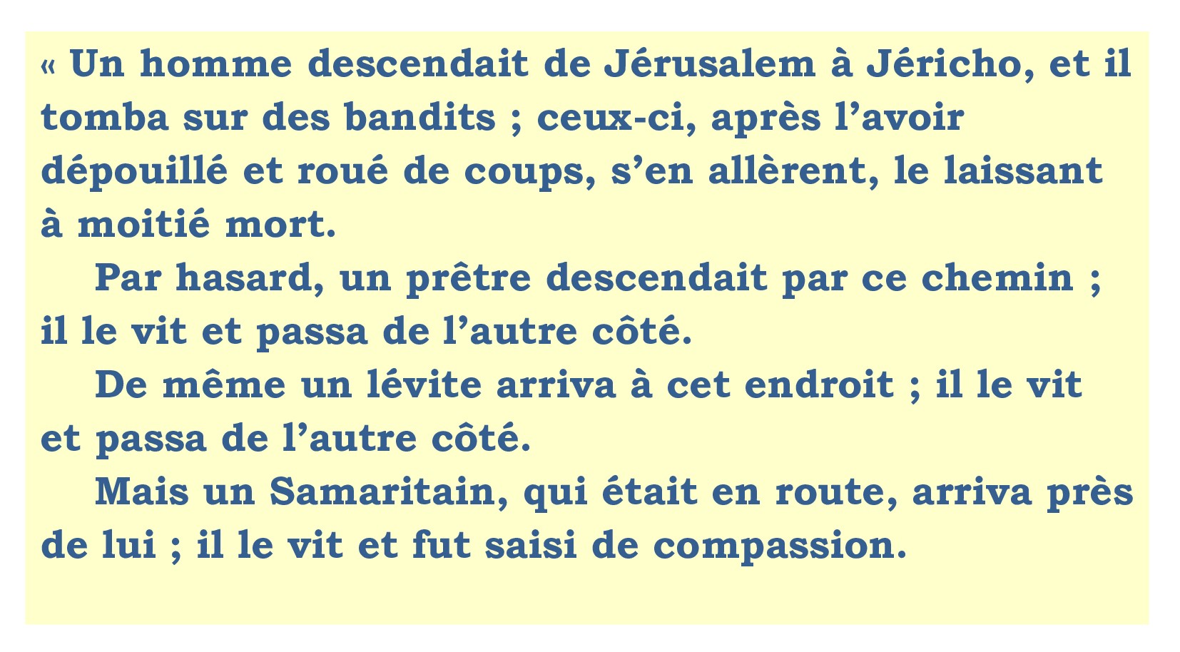 L’Évangile de ce jour nous invite à réécouter la parabole du Bon Samaritain, que Jésus raconte, suite à la question d’un docteur de la loi : « et qui donc est mon prochain ? »