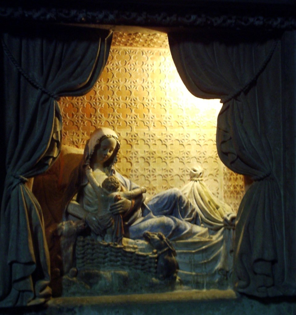 Je regarde plus attentivement le décor : le drapé des rideaux ouverts sur une sorte d’alcôve, formant comme un sas nous introduisant à l’intérieur – la couleur chaude du mur éclairé d’une lumière vive qui vient baigner toute la scène – le drapé du lit qui semble occuper toute la place – la position des personnages, Marie allongée donnant le sein à l’enfant , ses bras enveloppant le nouveau-né qui lui aussi entoure sa mère de ses petits bras potelés – les animaux qui se tiennent au pied du berceau tressé…
