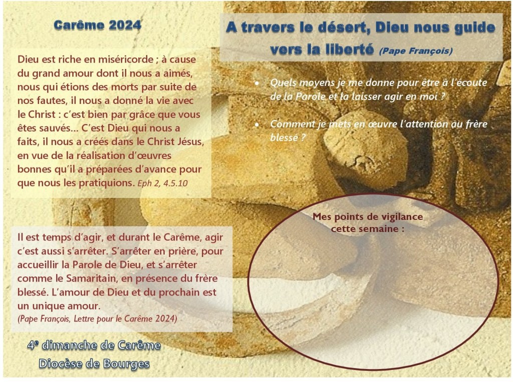« A travers le désert, Dieu nous guide vers la liberté » 4e semaine Carême Publié le 10 mars 2024 par edvsmp Laissons-nous envelopper par la miséricorde de Dieu Partager : Cliquer pour partager sur X(ouvre dans une nouvelle fenêtre) X Cliquez pour partager sur Facebook(ouvre dans une nouvelle fenêtre) Facebook J’aime chargement… Similaire