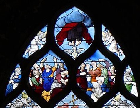 Ce vitrail, bien approprié au temps liturgique que nous vivons, articule la résurrection et l’ascension.