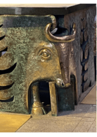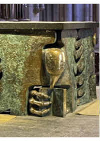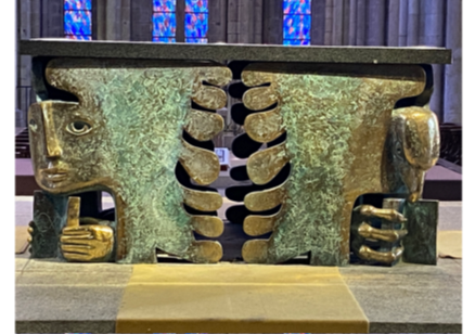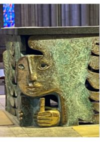 Dans la cathédrale de St Malo, l’autel a été réalisé sur des dessins d’Arcabas, auxquels son fils Etienne a donné une forme sculptée. La table de l’autel est soutenue par les quatre symboles des quatre évangélistes. Une même production artistique représente la solidarité des deux tables de la Parole et de l’Eucharistie.