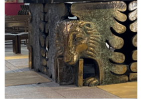 Les quatre évangélistes sont disposés aux « quatre coins » de l’autel, vers les quatre points cardinaux…La Parole destinée à être proclamée à toutes les nations.
