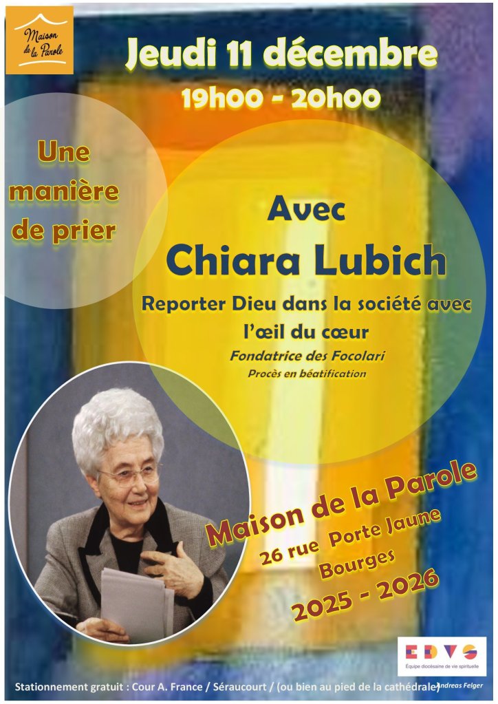 A VENIR A LA MAISON DE LA PAROLE 26 RUE PORTE JAUNE A BOURGES Partager : Cliquer pour partager sur X(ouvre dans une nouvelle fenêtre) X Cliquez pour partager sur Facebook(ouvre dans une nouvelle fenêtre) Facebook J’aime chargement…