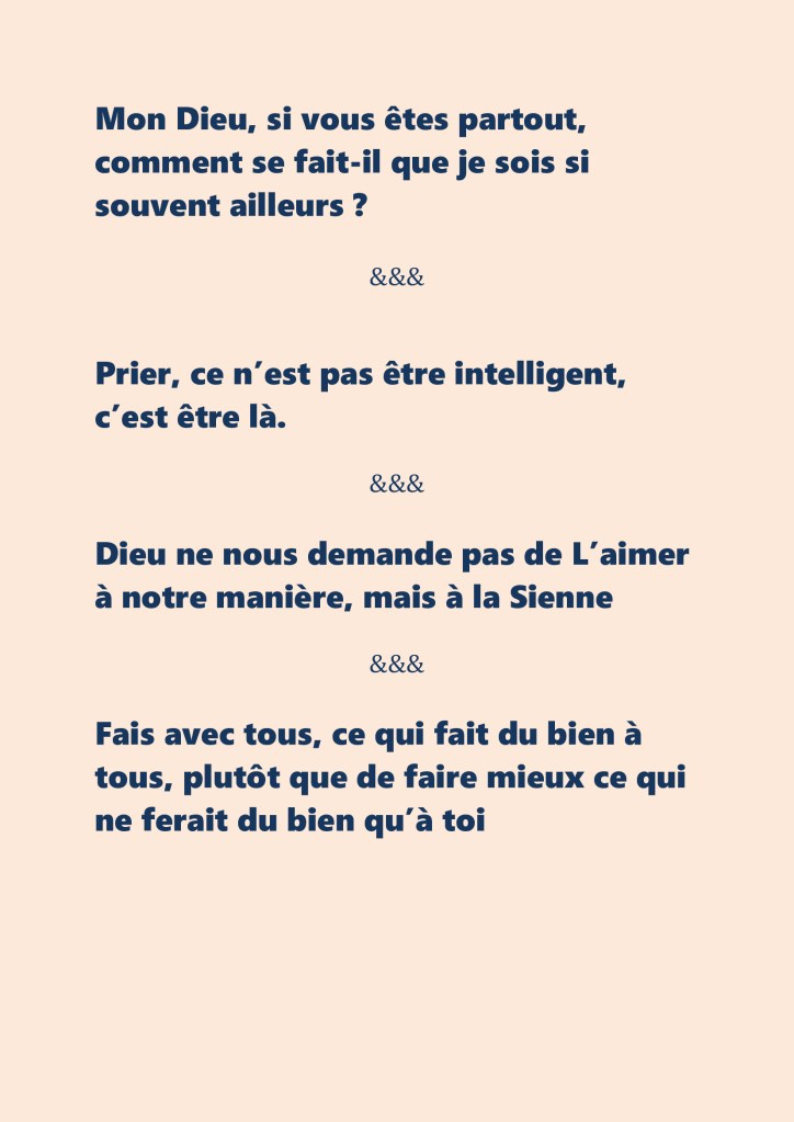 Le jour où nous comprendrions cela, nous irions dans la vie comme des sortes de prophètes, comme des voyants de vos petites providences, comme des agents de vos interventions. Rien ne serait médiocre, car tout serait voulu par vous. Rien ne serait trop lourd, car tout aurait racine en vous. Rien ne serait triste, car tout serait voulu de vous. Rien ne serait ennuyeux, car tout serait amour de vous. Nous sommes tous des prédestinés à l’extase, tous appelés à sortir de nos pauvres combinaisons, pour surgir, heure après heure, dans votre plan. Nous ne sommes jamais de lamentables laissés pour compte, mais de bienheureux appelés, appelés à savoir ce qu’il vous plaît de faire, appelés à savoir ce que vous attendez à chaque instant de nous : des gens qui vous sont un peu nécessaires, des gens dont les gestes manqueraient si nous refusions de les faire. La pelote de coton à repriser, la lettre à écrire, l’enfant à lever, le mari à dérider, la porte à ouvrir, le récepteur à décrocher, la migraine à supporter : autant de tremplins pour l’extase, autant de ponts pour passer de notre pauvre, de notre mauvaise volonté, au rivage serein de votre bon plaisir.