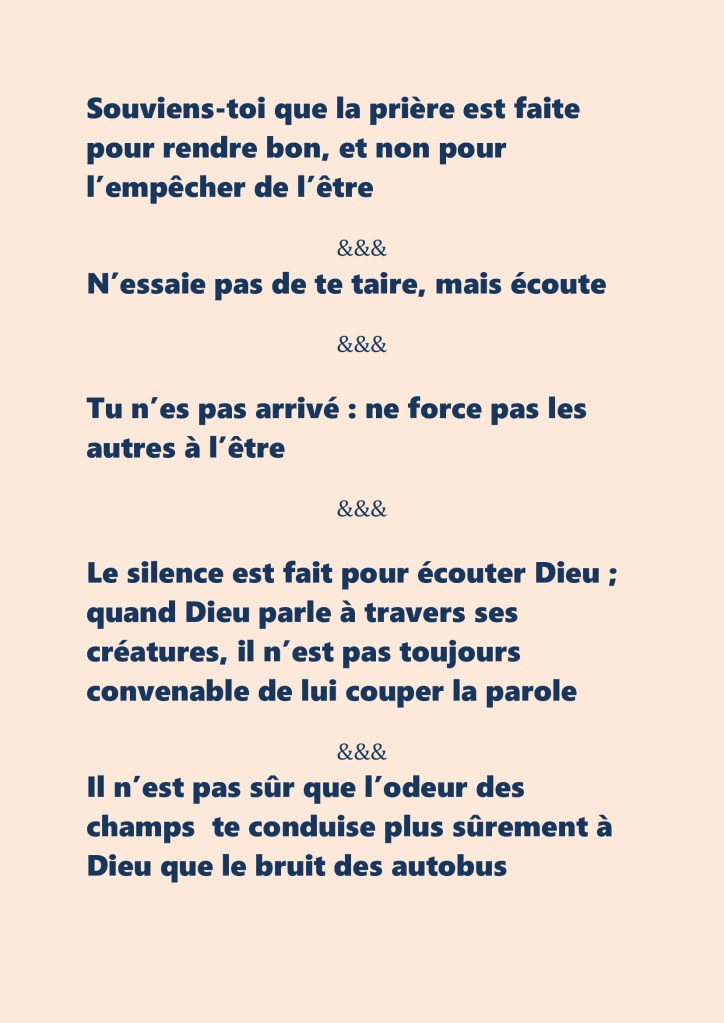 Quand on s'aime, on aime être ensemble et quand on est ensemble on aime à se parler. Quand on s'aime, il est ennuyeux d'avoir toujours autour de soi beaucoup de gens. Quand on s'aime, on aime écouter l'autre, tout seul, sans d'autres voix qui viennent nous gêner. C'est pourquoi ceux qui aiment Dieu ont toujours chéri le désert et c'est pourquoi à ceux qui l'aiment Dieu ne peut pas le refuser. Et je suis sûr, mon Dieu, que tu m'aimes et que dans cette vie si encombrée, touchée de tous côtés par la famille, les amis et tous les autres, îl ne peut être absent ce désert où l'on te rencontre. On ne va jamais au désert sans traverser beaucoup de choses, sans être fatigué par une longue route, sans arracher ses yeux à ce qui est leur horizon de tous les temps. Les déserts se gagnent, ils ne se donnent pas. Les déserts de notre vie, nous ne les arracherions au secret de nos heures humaines qu'en violentant nos habitudes, nos paresses. C'est difficile, mais essentiel à notre amour.