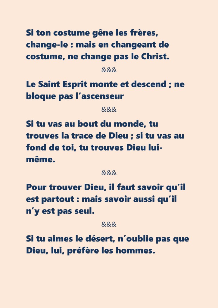 Quand on sait ce que nous sommes, il serait ridicule, vraiment, de n’avoir pas dans notre amour, un peu d’humour. Car nous sommes d’assez comiques personnages. Mais mal disposés à rire de notre propre bouffonnerie. Seigneur, je vous aime plus que tout… en général… mais tellement plus que vous, dans cette petite minute qui passe, une cigarette anglaise… ou même gauloise ! Seigneur, je vous donne ma vie, toute ma vie… mais pas ce tout petit morceau de vie, ces trois minutes où je n’ai tellement pas envie d’aller travailler. Seigneur, vous gagner la ville, et la France et l’univers, me consumer pour votre règne… mais…mais ne pas écouter cette insupportable créature qui me raconte pour la centième fois ses minuscules ennuis. Oui, nous sommes des héros de comédie bouffe et de cette comédie, il serait normal que le premier public soit nous. Mais là n’est pas le bout de l’histoire. Quand on a découvert cet impayable comique, quand on est parti d’un grand éclat de rire en récapitulant la farce de sa vie, on est tenté de s’abandonner, sans plus, à une carrière de clown pour laquelle après tout on semble assez doué. On serait volontiers tenté de penser que cela n’a pas grande importance et qu’à côté des sublimes, des forts, des saints,