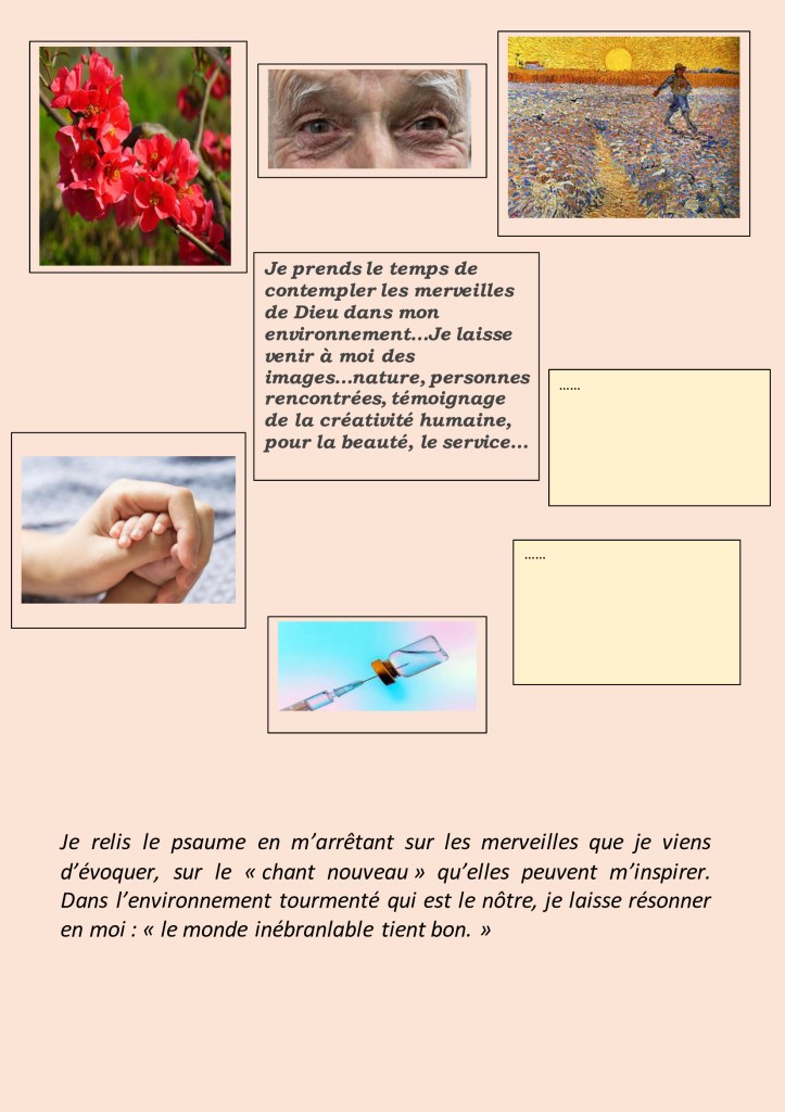 En même temps, des difficultés vécues ces jours-ci peuvent rendre difficile ma louange. Je les partage au Seigneur, comme un ami parle à un ami, je peux formuler une prière d’intercession…Que cela ne m’empêche pas de continuer à ouvrir les yeux sur ce qui reste bon autour de moi…et peut, malgré tout, susciter ma louange.