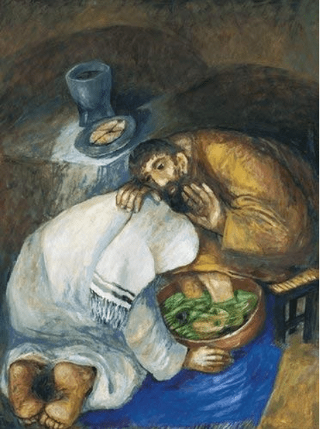 Et ses pieds à lui ? Quelqu’un les a-t-ils lavés après qu’il eut rendu ce service à ses amis ? Ils ne semblent pas avoir été rafraîchis par les ablutions rituelles au début du repas juif. Ou alors, ces écorchures seraient-elles une façon pour l’artiste de laisser entrevoir la rigueur du chemin que Jésus devra encore parcourir ?