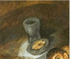Sur la table, l’artiste a placé une coupe et une assiette couleur étain. Elles émergent de l’ombre à l’arrière-plan. Dans son récit de la Dernière Cène, Jean ne mentionne pas le pain et le vin. Est-ce que l’artiste veut corriger une omission?