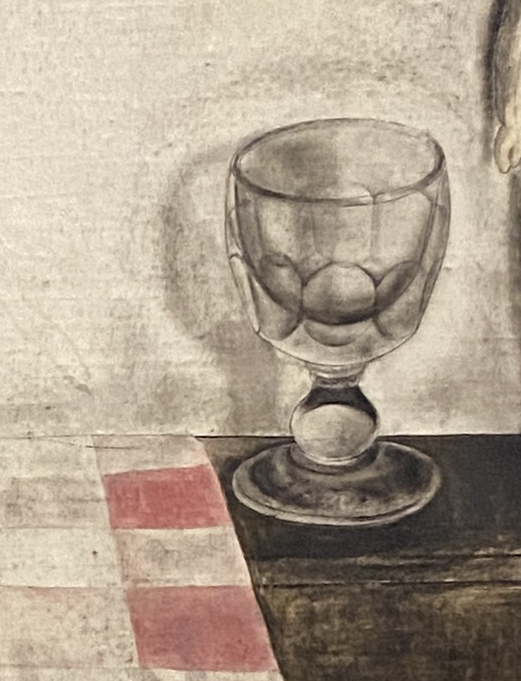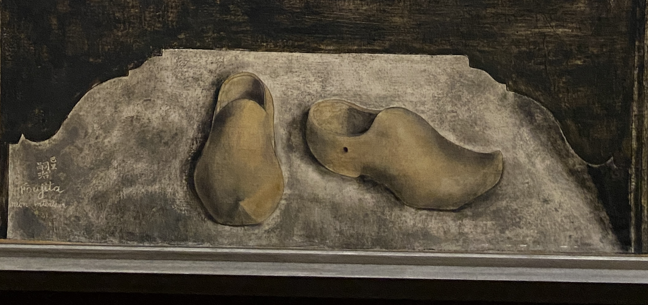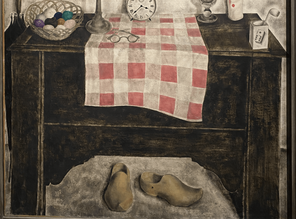 Une « nature morte » et pourtant la suggestion d’un délicat mouvement. Les sabots, comme abandonnés précipitamment et prêts à reprendre la marche, le pétrole à moitié consumé, le torchon, comme animé par un souffle léger. La vie intérieure, en retrait, sans être indifférente au mouvement du monde.