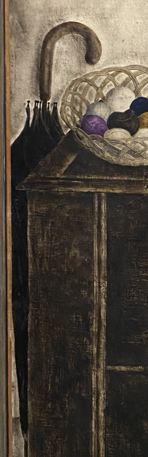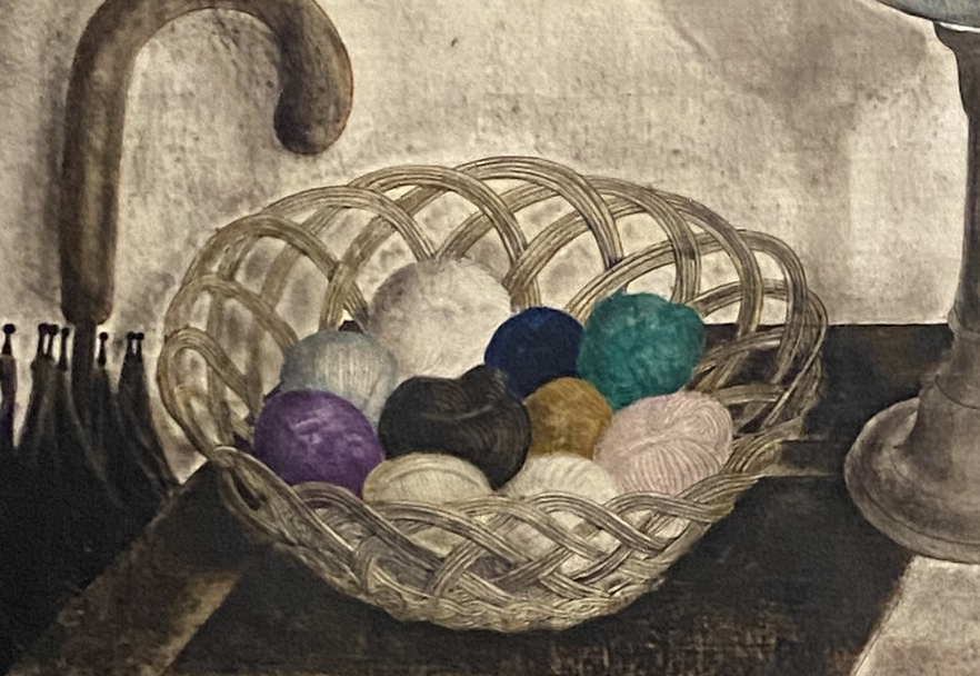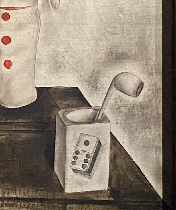 Au centre du tableau, le réveil, disant l’écoulement du temps…dans l’ambiguïté d’un cadran deux fois parcouru en une journée. Approchons-nous de quatre heures du matin, vers une journée encore à venir, ou sommes-nous proches de quatre heures de l’après-midi, où la journée est déjà bien entamée ? Le temps qui se déroule est aussi évoqué par la corbeille de pelotes de fils de diverses couleurs. Le domino figuré sur le pot contenant la pipe évoque aussi le jeu, le hasard…La vie intérieure se situe dans une histoire, connaît des « moments » différents, et cherche à les relier dans une relecture.