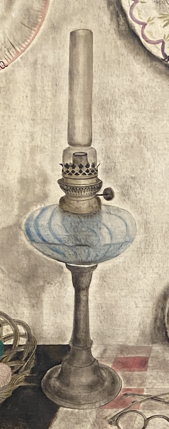 J’observe longuement ce tableau. Je m’arrête à sa composition, au jeu des couleurs, et je nomme chacun des objets de cette nature morte. Me laissant guider par le nom donné par le peintre à ce tableau, « mon intérieur », je m’interroge sur le choix des objets représentés, et sur leur symbolisme. Le peintre se rend présent par ses lunettes bien reconnaissables.