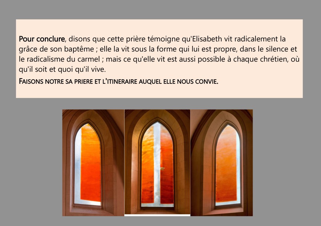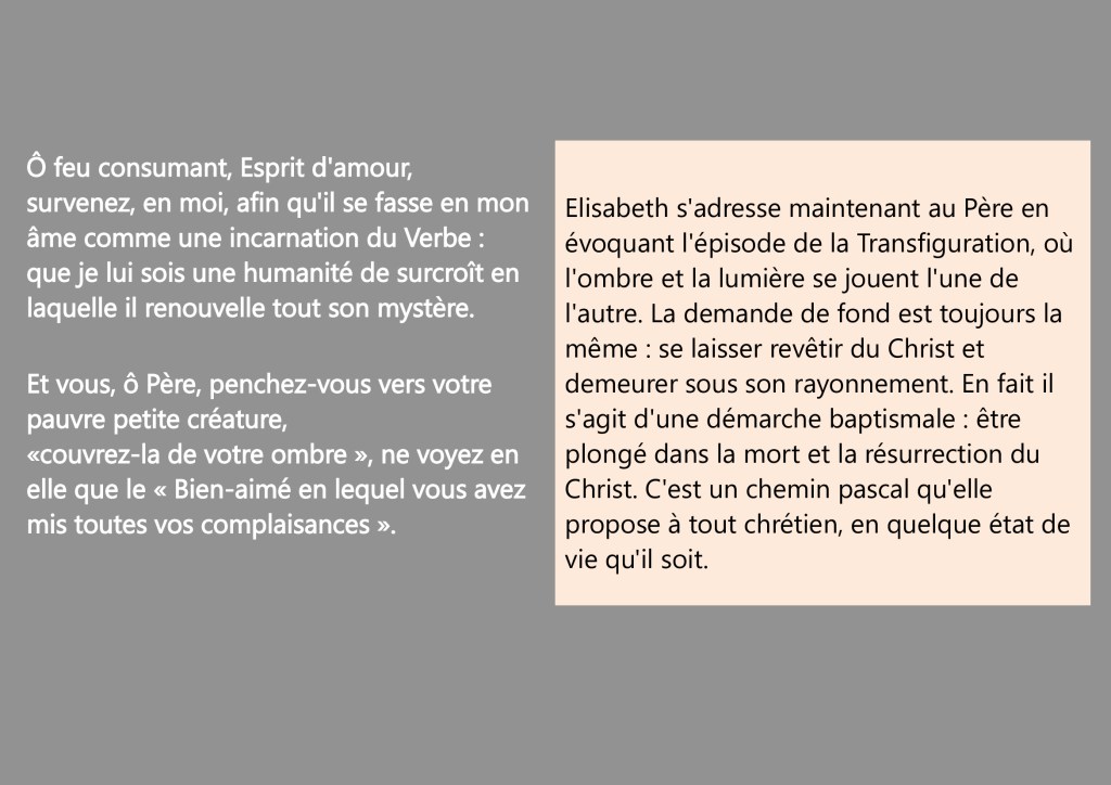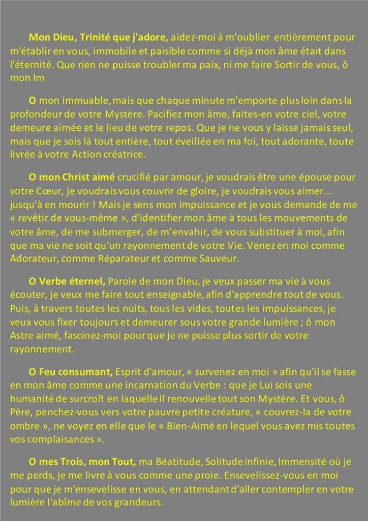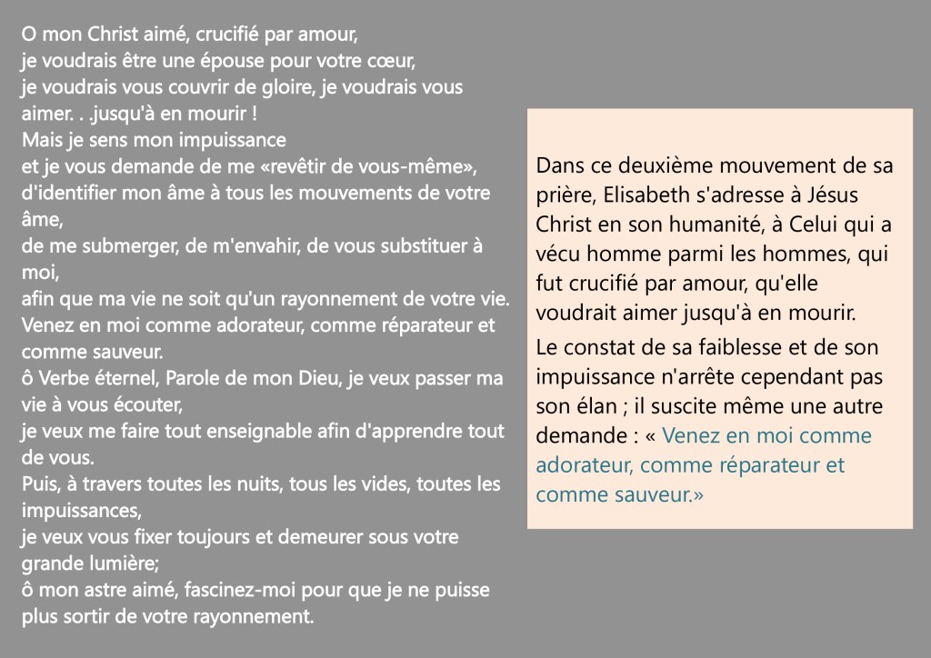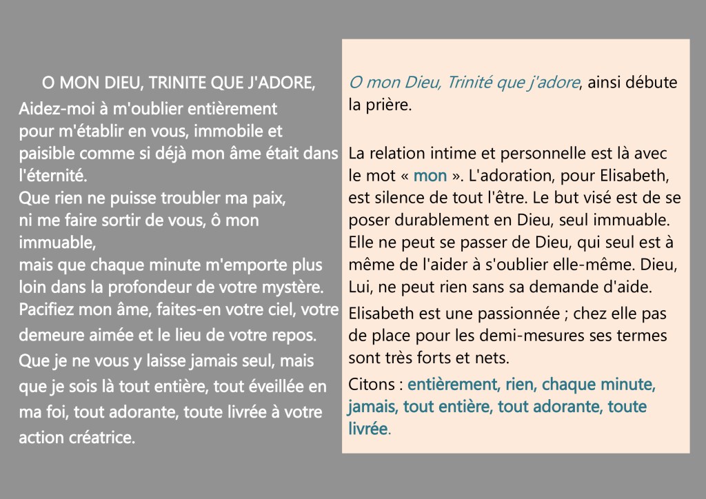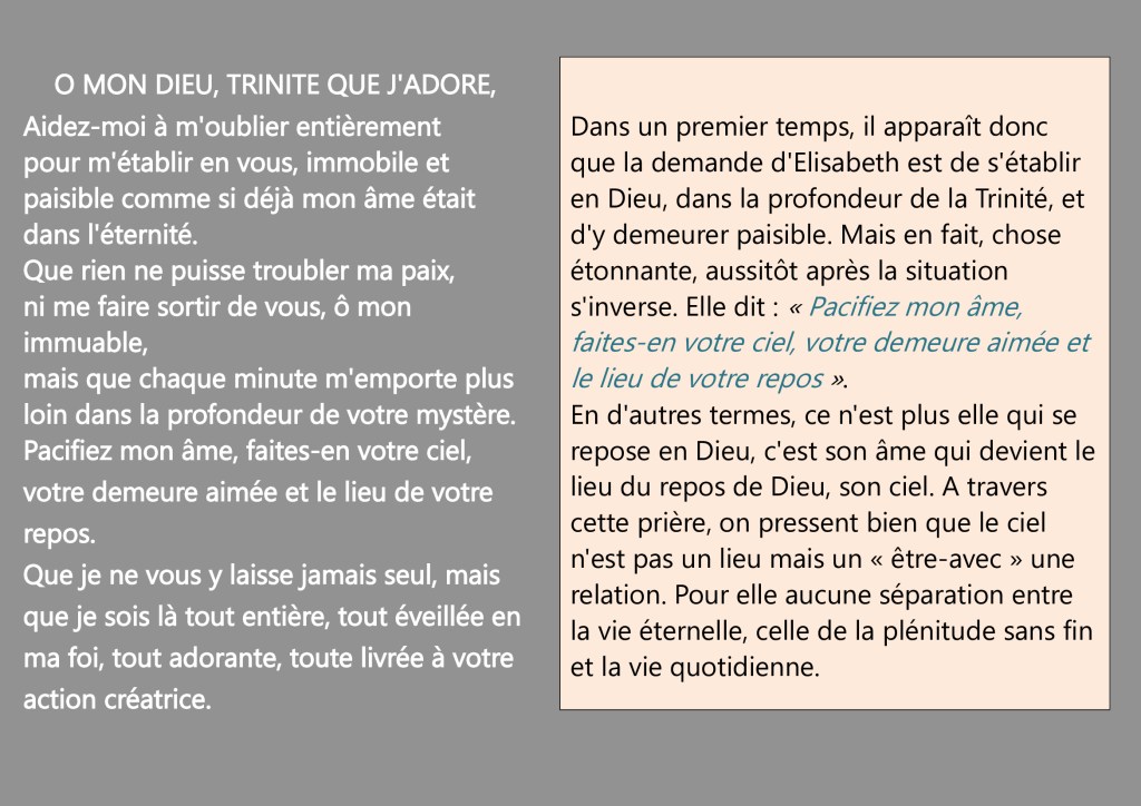 Cette prière est un dialogue d’amour, la flamme ardente d’un Je, Elisabeth, qui s’adresse à un « Tu », Dieu. Approcher cette prière, c’est risquer quelques pas dans l’intimité d’une relation. Mais Elisabeth nous invite à oser ces pas