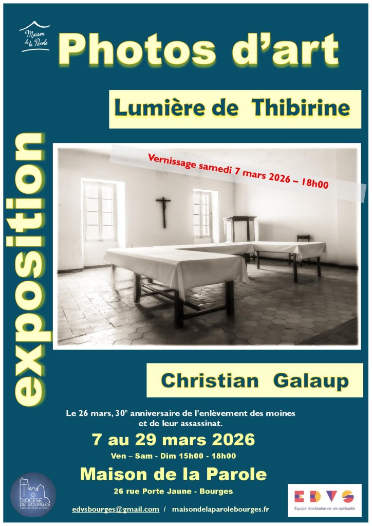 Une exposition de photos: « Lumière de Tibhirine » du 7 au 29 mars, avec des propositions de méditation si l’on veut.